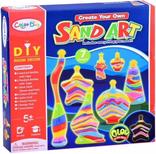 Dette komplette sæt indeholder alt, hvad du behøver for at skabe unikke dekorationer: plastflasker og vedhæng i legende former, 8 poser med farvet sand, tragt og lille spartel til nem påfyldning, farvede snore samt vejledning. De færdige kreationer pynter på børneværelset eller fungerer som en kær, håndlavet gave.