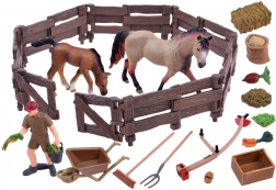 Indhegning med låge, bonde, fodertrug, trillebør og madforsyninger – alt til fuldendt leg på landet.