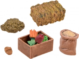 - Hestefigur (hoppe), følfigur, bondefigur, indhegning med låge, trillebør, fodertrug/krybbe, høtyv, kost, håndkultivator, sæk med korn, høballe, halm, grøntsager (kål, rødbede, gulerod)