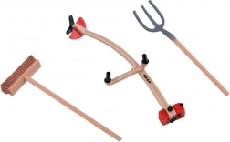 Høtyv, kost, håndkultivator, høballer og en kasse med grøntsager giver legen autenticitet og variation.