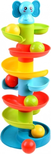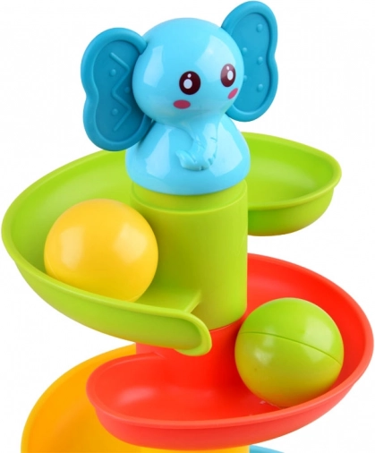 Denne farverige, spiralformede kuglebane med en charmerende lille elefant på toppen fanger straks børns opmærksomhed. Seks farvede platforme danner en glidende bane, hvor kuglerne ruller hurtigt ned, mens de behageligt rasler. Elefanten har et blødt gummiøre, der egner sig som skånsomt bidelegetøj ved tandfrembrud.