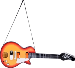 Pakken indeholder en rem for komfortabel bæring og spil i stående position. Guitaren er lavet af holdbar plast, drives af 3× AA (medfølger ikke) og støtter fint rytme, motorik og selvtillid hos små musikere.