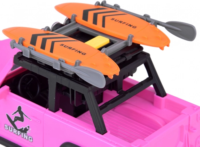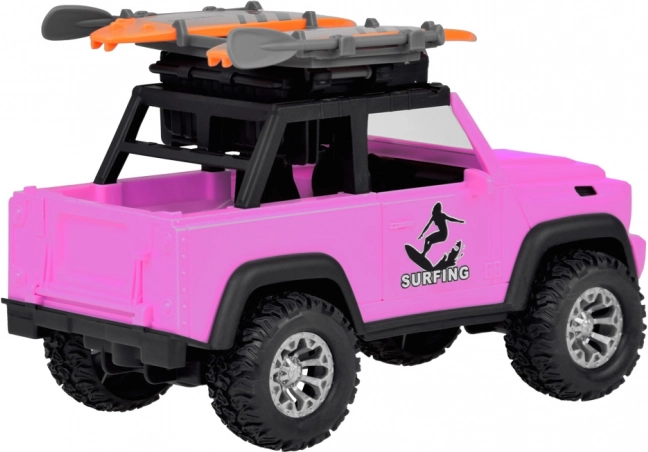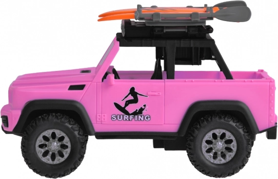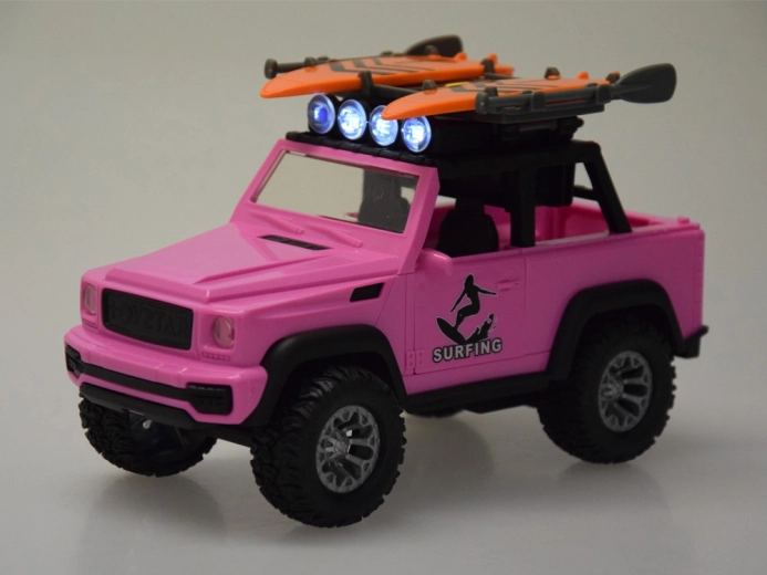 En stilfuld lyserød terrængående bil til små eventyrere med lys- og lydeffekter, åbningsbare døre, klapbart bagagerumslåg og store gummihjul med markant mønster. På taget finder du en bærer med to surfbrætter og en lysbjælke for en endnu mere realistisk leg.