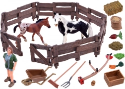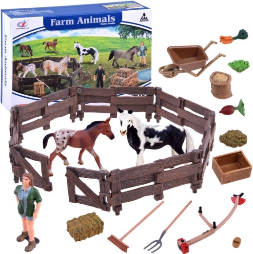 Dette omfattende sæt bringer en komplet bondegårdsscene til dit bord. Du finder en stor hest, et sødt føl, en bondefigur og en række redskaber og tilbehør til dyrepleje. Realistiske proportioner, stærke farver og præcise detaljer gør sættet til både legetøj og et pædagogisk redskab.