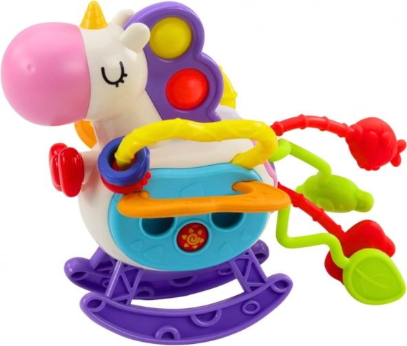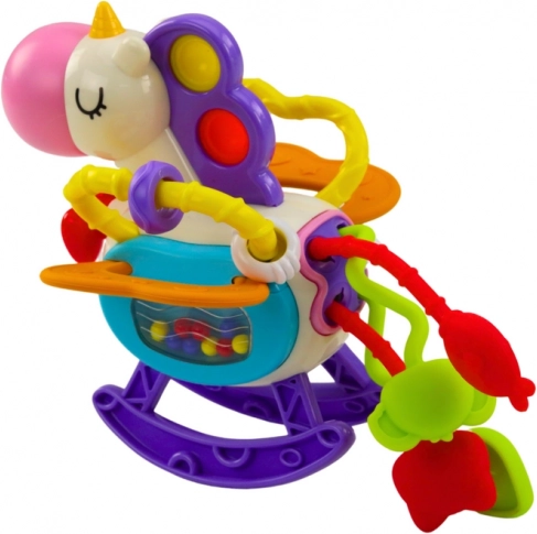 Hesten er udstyret med bløde gummidele, ideelle til at tygge på og udforske forskellige teksturer, samt rangler der ved rysten afgiver behagelige lyde, hvilket stimulerer høresansen og den motoriske koordination.