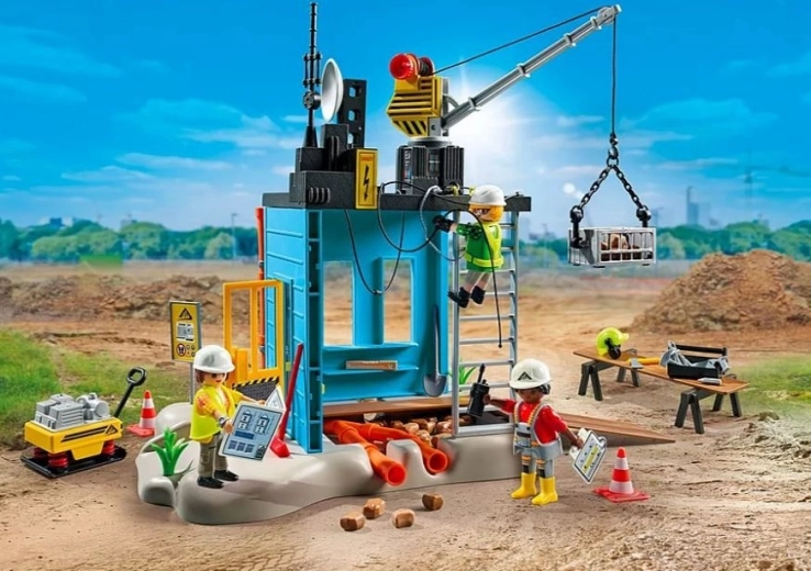 Dette PLAYMOBIL-sæt fra serien Action Heroes bringer en levende scene fra en travl byggeplads. Sættet indeholder en byggebase med vægelementer, tagholder og en funktionel kran til løft af materialer. Tre figurer med sikkerhedshjelme og værktøj forbereder alt fra kabelføring til montering af rør.