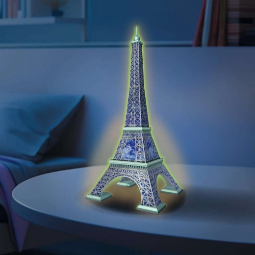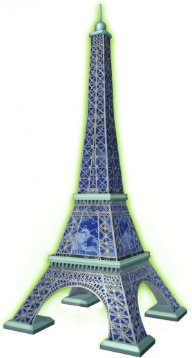 Byg det legendariske Eiffeltårn som en strålende dekoration! Dette kvalitets 3D-puslespil fra RAVENSBURGER indeholder 224 plastikbrikker, der passer præcist sammen og danner en stabil 3D-model. Den specielle fluorescerende print lyser i mørke efter opladning med lys, så modellen bliver et unikt indslag i dit rum.