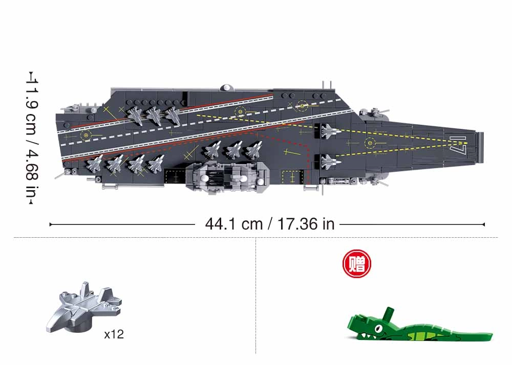 På land, i vandet, i luften. Behersk rummet! Skibet med en længde på 44,1 centimeter giver et bredt udvalg af lege- og spilmuligheder. Landingsdækket kan benyttes af 12 fly, som er en del af pakken. Den innovative Sluban-byggeserie kan kombineres med lignende byggesæt fra mange andre førende producenter. De er fremstillet af kvalitets-ABS-plast, som er sikker og holdbar. Hvert byggesæt leveres med samlevejledning og er pakket i en farverigt trykt papæske.