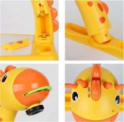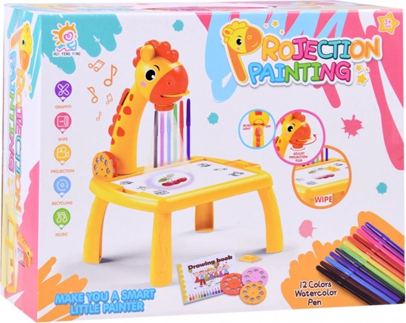 Den søde tegneprojektor formet som en giraf projicerer motiver på papir, bord eller væg og hjælper børn med nemt at tegne efter og male. Sættet inkluderer et tegnebord, 12 tuscher, 3 sæt dias (dyr, frugt og grøntsager, køretøjer) samt praktiske holdere til tilbehør – ideelt til at udvikle kreativitet og finmotorik.