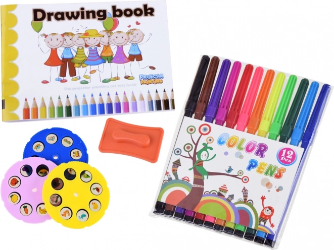 I pakken finder du 12 farvede tuscher, 3 runde diske med dias (hver med 8 motiver), notesblok, underlag, svamp og holdere til skriveredskaber. Projektoren kan bruges bredt – fra leg og læring til aftenprojicering på væggen.
