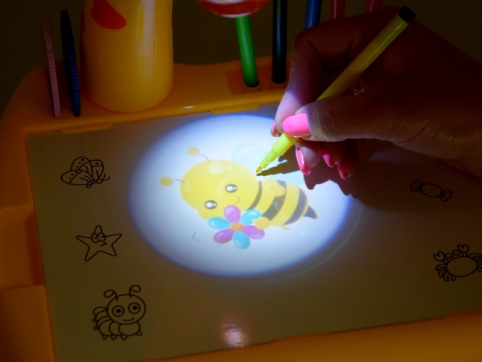 Projektoren projicerer klare skabeloner fra diskene direkte på tegnefladen, så børn nemt kan tegne efter og lære at male trin for trin.