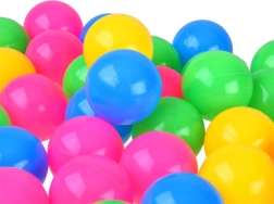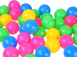 Denne pakke indeholder 100 farvede bolde, som er perfekte til børns legerum. Boldene har en diameter på 6,5 cm og findes i fire klare farver: pink, gul, grøn og blå, hvilket gør dem attraktive for børn og fremmer leg.