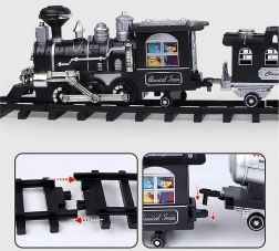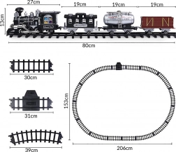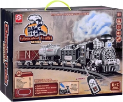 Pakken indeholder et damplokomotiv, vogne, skinner, fjernbetjening, doseringsenhed og skruetrækker. Til strømforsyning kræves 6 AA batterier (ikke inkluderet i pakken)