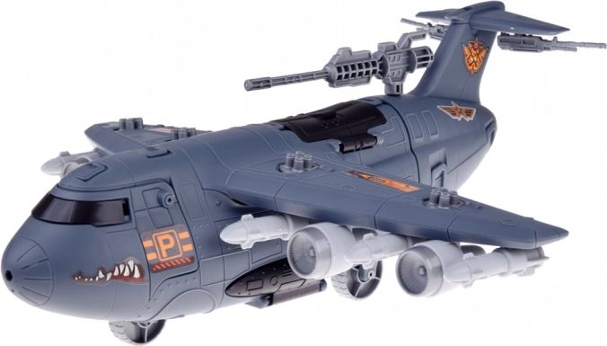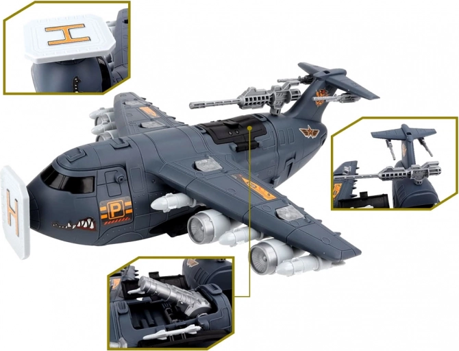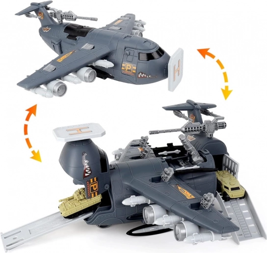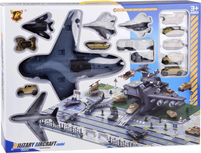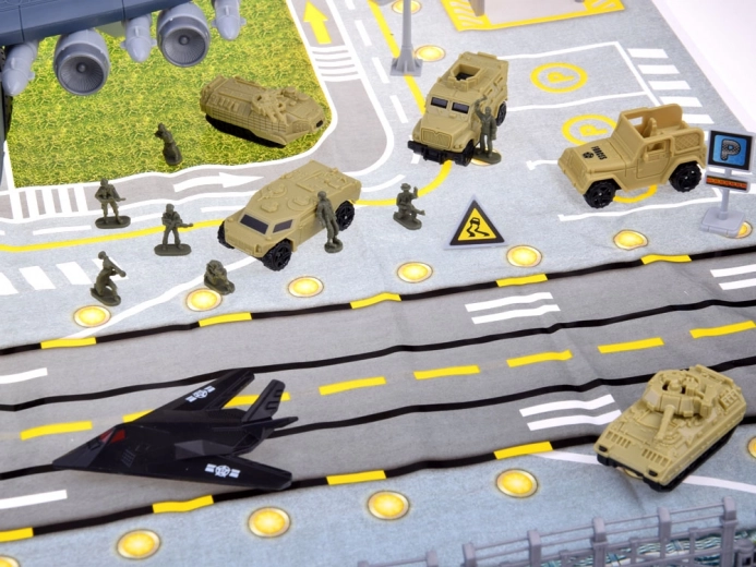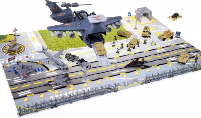 Stor lufthavn militær base med fly er for fans af flylege, som helt sikkert vil give mange timers strategisk underholdning. Sættet er professionelt udarbejdet med omhu for fine militære detaljer, designet til små strateger, chauffører og piloter i hæren. Det store militærfly har en række funktioner, som den lille pilot kan bruge i timevis af leg. Flyet har et åbent cockpit til piloten, en udtræksrampe, en åbning i den bageste del til lastrummet, hvor der er plads til fragt. Dette flyvende militærkøretøj er udstyret med et stort antal kanoner og raketter. Ved at åbne lugen placeret i den øverste del af flyet er det muligt at skubbe en kanon ud. På vingerne af flyet er der også skjulte våben, som kan placeres i holderne. Sættet er udstyret med en måtte med mange vejbaner og fungerer som et terræn til militære køretøjer, som vil underholde enhver lille fan af militærlege i timevis.
