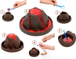 Hele eksperimentet begynder med at tage beskyttelsesbriller på. For at udløse udbruddet måler du den passende mængde tilsætningsstoffer med en ske og lægger dem i vulkanen. Brug rørepinden til at blande det hele grundigt. Hæld vand i bægeret, og tilsæt det til pulveret med sprøjten, hvilket skaber et spektakulært udbrud.