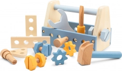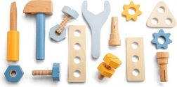 Sættet indeholder 16 funktionelle dele: hammer, skruetrækker, nøgle, søm, skruer og tandhjul til uendelige legevariationer. Produktet er lavet af FSC-certificeret træ og er dermed et bæredygtigt valg for både forældre og planeten.