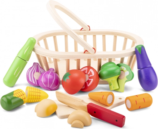 Opdag et sjovt og lærerigt legetøj til børn fra 2 år: et træsæt med grøntsager, kurv, skærebræt og en sikker kniv. Hver del er delt i to halvdele og forbundet med velcro for nem “skæring” og samlin... Vis mere