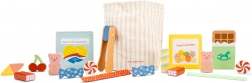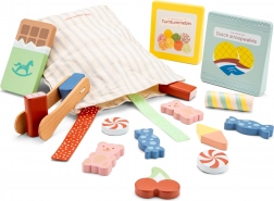 Dette træslik-sæt vil glæde alle små fans af butik- eller caféleg. Det rummer et farverigt udvalg af træslik – fra chokoladebar til vingummibamser – omhyggeligt udført, så de ligner de ægte. Der medfølger en praktisk bomuldstaske til opbevaring og en lille træ-tang til sjov servering.