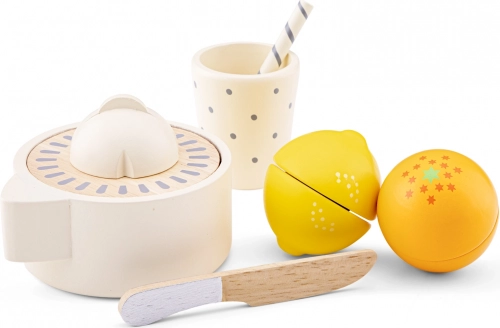 - Sættet indeholder: citruspresser, appelsin og citron med velcro, trækniv, bæger med sugerør
