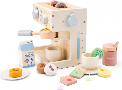 Der medfølger et rigt sæt tilbehør: 6 farvede kaffekapsler, 2 teposer, et mynteblad, en citronskive, en sukkerskål, en mælkekande samt 2 kopper med underkopper. Leg med kaffemaskinen understøtter hånd–øje-koordination, læring gennem leg og udvikling af selvstændighed.