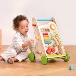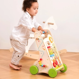 Trægangstativet er designet til at guide børn sikkert gennem deres første skridt. Takket være gummihjulene er det stille og skånsomt mod gulve. Sjove og interaktive elementer som tandhjul, spejl og xylofon fremmer opdagelse og læring. Gåstativets mål: 32 x 32 x 49 cm.