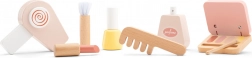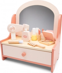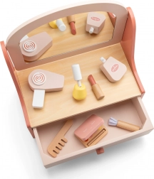 Sættet indeholder trætilbehør som børste, læbestift, parfume flaske, hårtørrer, neglelak, øjenskyggepalet og pensel, der understøtter kreativ leg.