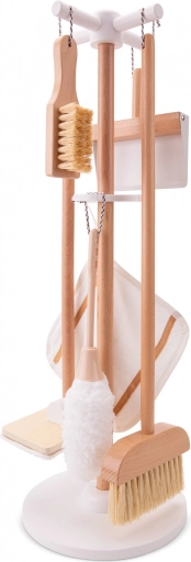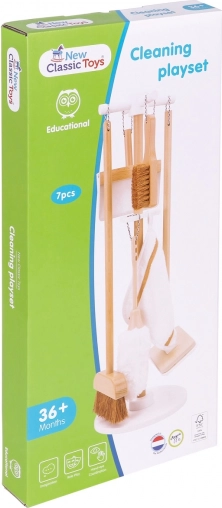 Sættet indeholder moppe, kost, støvekost, rengøringsklud, fejebakke og håndkost. Børn kan lege og lære at bruge alle redskaberne ligesom de voksne.