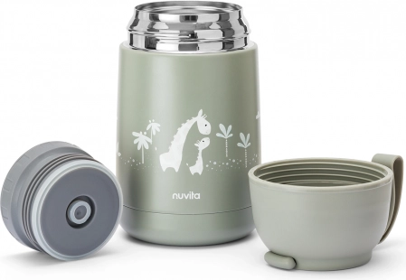 Termoflaske i rustfrit stål er den ideelle ledsager på gåture eller udflugter med børn. Takket være den dobbeltvæggede konstruktion og vakuumisolering holder den maden varm i op til 12 timer og drikke kolde i op til 24 timer. Flasken har en lufttæt skruelukning med trykventil, som forhindrer lækage og sikrer stabil temperatur. Det praktiske låg kan bruges som kop, og den brede åbning gør rengøringen nem. Det justerbare silikonehåndtag gør det nemt at fastgøre den til barnevognen, mens den skridsikre silikonebund er modstandsdygtig over for ridser.