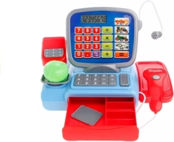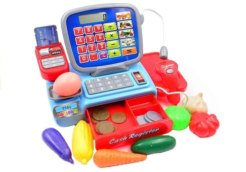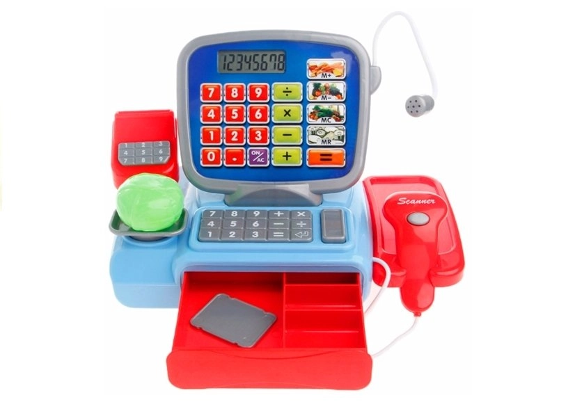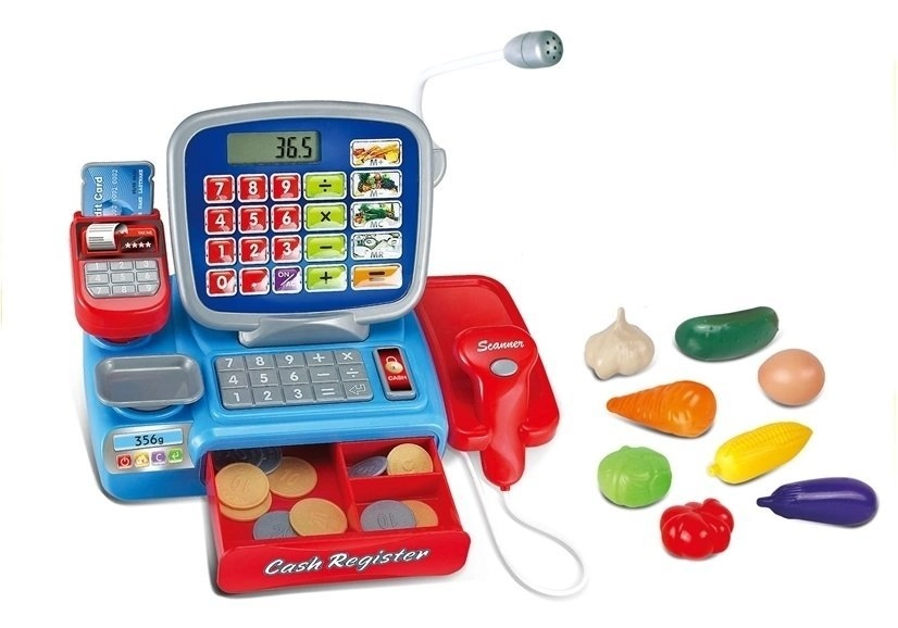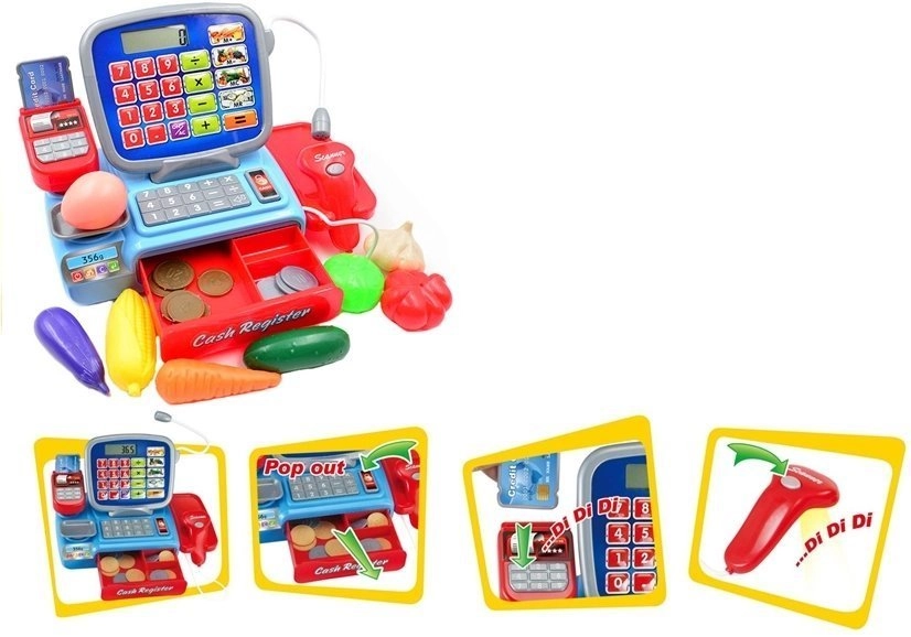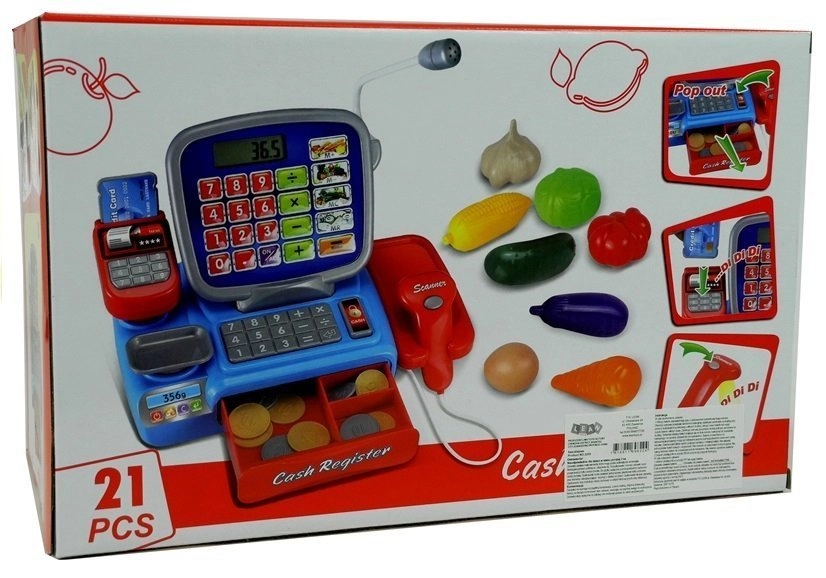 Det funktionelle kasseapparat er ideelt til at lære at tælle, sælge og købe. Det elektroniske kasseapparat har en fungerende scanner, som udsender lyde og lyser op, når man trykker. Kasseapparatet fungerer også som en lommeregner, så du kan lægge produktpriser sammen og samtidig lære at regne. Kasseapparatet har en imitation af en mikrofon og en udtræksskuffe til mønter. Ved siden af kassen er der en vægt, hvor de medfølgende madvarer kan vejes. Barnet kan tage imod betalingskort og bruge mønter.
