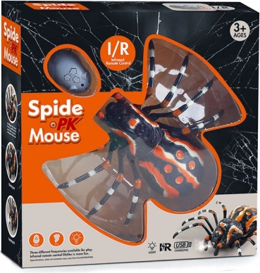 Den infrarøde fjernbetjening med to knapper giver intuitiv betjening: med én knap kører du fremad, og med den anden udfører du en 360° rotation. Modellen er ideel til hjemmeleg, små drillerier og som et sikkert “terrarium-alternativ” for børn, der elsker edderkopper.