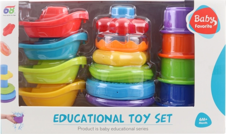 Dette farverige første-læringssæt tilbyder alt, hvad små børn elsker: ringe til stabling, kopper til at stable og både til vand. Hvert element er designet til at understøtte sansning, lære farver og tal og sikker udforskning af verden.