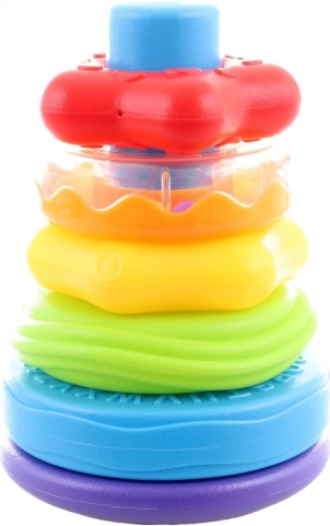 Farvede ringe i forskellige størrelser lærer at skelne mellem former og farver, udvikler finmotorik og tålmodighed ved at stable på stangen.