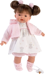 Funktionalitet: Når sutten tages ud af munden, siger dukken "mama", "papa" og laver lyde som et grædende barn. Lydene kan dæmpes med en magnetisk sut. Modellen indeholder ikke tøj; vi anbefaler at købe det originale Llorens tøj i størrelse 33 cm.