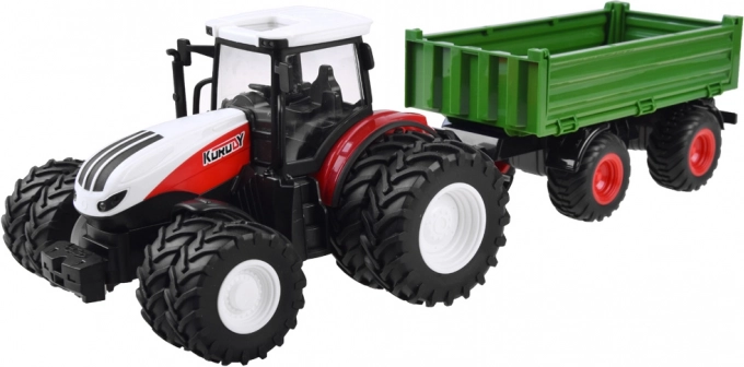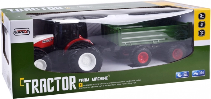 Fjernstyret traktor 2,4 GHz. Ottehjuls rød traktor med grøn trailer vil glæde enhver ung traktorbruger, landmand eller bonde. Takket være fjernbetjeningen, som giver fuld kontrol over traktoren, bliver enhver opgave for den lille landmand let og helt under kontrol. Fjernbetjeningen gør det muligt at køre frem og tilbage samt dreje til venstre og højre.