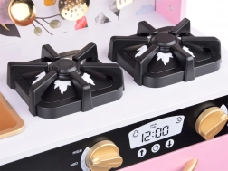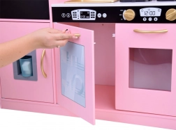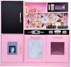 Træ retro køkken i rosa med elegante gyldne detaljer og blomstermotiv. Fremmer fantasifuld leg og lader børn blive små kokke med deres egen restaurant.