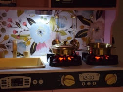 • Køkkenet inkluderer gryde, kasserolle, låg, grydeskeer og endda kridt til tavlen.