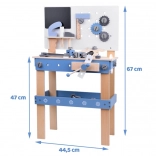 Denne træarbejdsbænk til børn er designet til at udvikle fingerfærdighed, koordination og logisk tænkning. Det farverige tilbehør – fra skruer, møtrikker og forbindelseslister til tandhjul, lineal, skruestik, hammer og skruetrækker – gør det muligt for børn at skrue, måle, fastgøre og eksperimentere med gear.