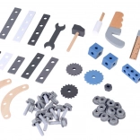 Værktøj (hammer, sav, nøgle, skruetrækker), skruestik, lineal med skala, skruer og møtrikker, tandhjul, forbindelseslister og klodser