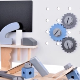 Sikkerheden kommer først: alle dele er glat slebne, med afrundede kanter og ikke‑giftige farver. Den integrerede skala på bordpladen lærer børn arbejdsorganisering og grundlæggende måling, mens den perforerede plade og de roterende tandhjul inviterer til fantasifuld leg.