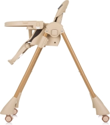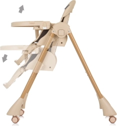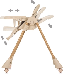 For ren og behagelig spisetid er der en dobbelt bakke – den øverste del kan til enhver tid fjernes og vaskes, mens den nederste bakke med beskyttende T-bøjle holder barnet sikkert på plads. Bakken kan skubbes frem og tilbage i 3 positioner. Fire hjul gør det let at flytte rundt i hjemmet, og efter måltidet kan højstolen nemt foldes til en kompakt størrelse for at spare plads.