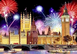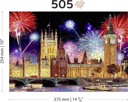 Forsiden byder på et farverigt motiv af natlige London med fyrværkeri, bagsiden et gentaget mønster til formbaseret samling. Ideelt til træning af koncentration og rumlig forestillingsevne.