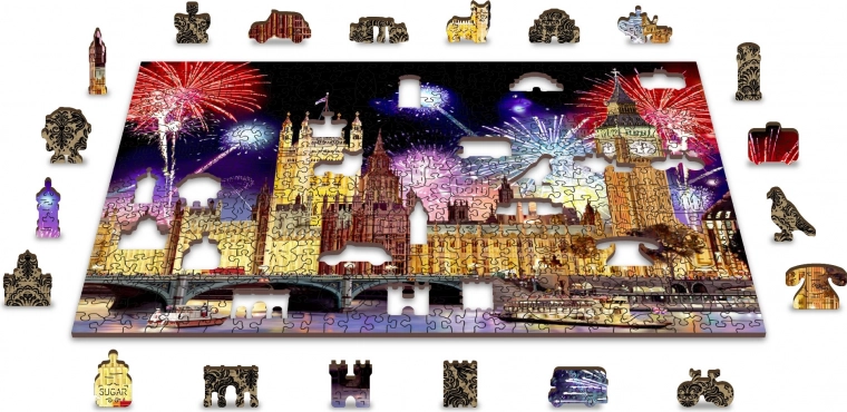 Træd ind i en verden af Londons ikoniske vartegn med træpuslespillet Natlige London fra WOODEN CITY. Takket være den præcise laserskæring har brikkerne glatte kanter uden splinter og passer perfekt sammen. Unikt formede brikker – fra dyr til berømte bygninger – skaber en usædvanlig oplevelse under samlingen, og nogle kan endda stå som små figurer.