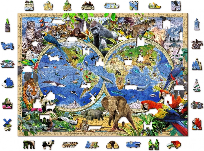 Træpuslespil WOODEN CITY Verdenskort med dyr, 1010 brikker. Laserskårne dyreformer, glatte kanter, øko-emballage uden plast. En fantastisk udfordring og gave.