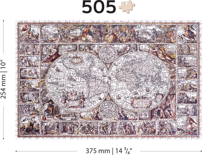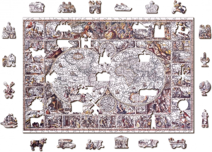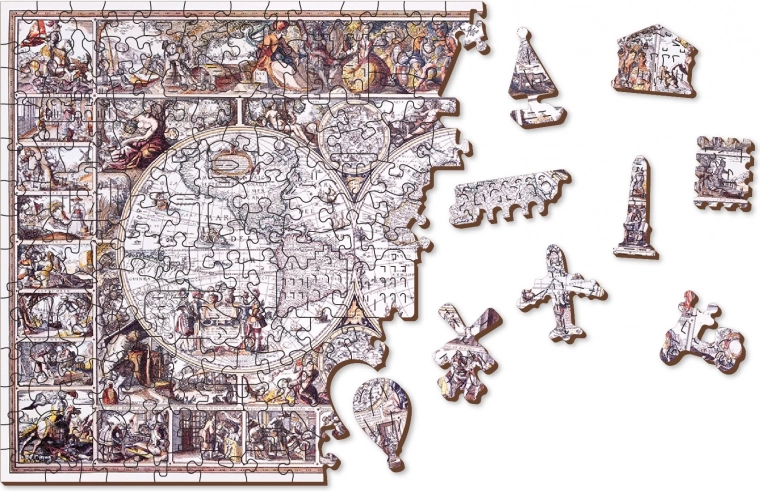 Oplev magien ved puslespil med unikke former: træpuslespillet WOODEN CITY “Opdagelsestidens kort” byder på 505 brikker med laserfremhævede detaljer, hvoraf nogle er formet som dyr, bygninger og genstande. Det er dobbeltsidet 2-i-1 til lægning efter både motiv og form, har glatte kanter, er lavet af en stærk HDF-plade med tykkelse 3–4 mm og er helt uden plastik.