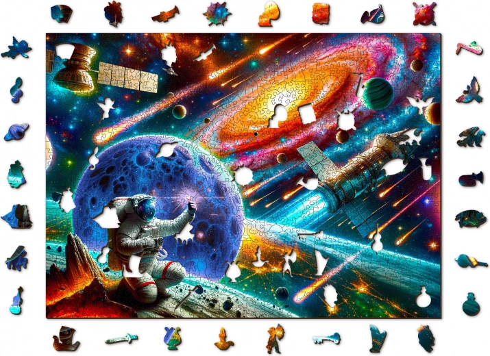 Oplev glæden ved at lægge puslespil med træpuslespillet WOODEN CITY Opdagelse af rummet. Takket være laserudskårne brikker, hvoraf mange har unikke dyreformer, får du et smukt motiv og samtidig en underholdende udfordring. Puslespillet byder på højere sværhedsgrad med færre brikker, glatte kanter uden splinter og er helt økovenligt uden plast.