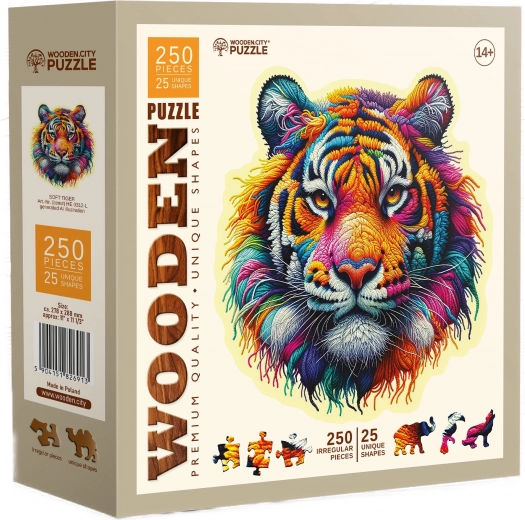 Træpuslespil Blid Tiger 250 brikker fra WOODEN CITY. Unikke dyrebrikker, laserbearbejdning, miljøvenlig emballage. En fremragende udfordring og gave.