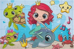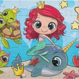 Smukt børnepuslespil med motiv af en havfrue og dyr fra undervandsverdenen. Indeholder 30 store brikker for nem samling, det færdige billede måler 29 × 18 cm. Ideelt som det første puslespil til børn, leveres i en gaveæske med hank for nem transport.
