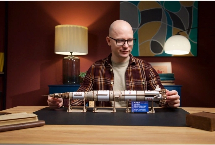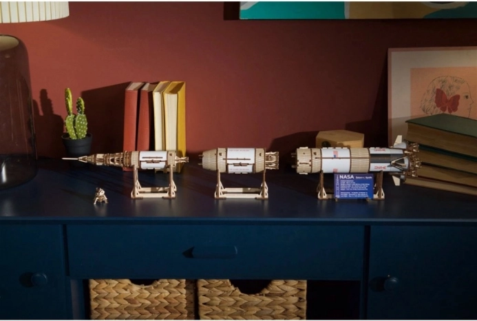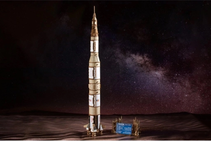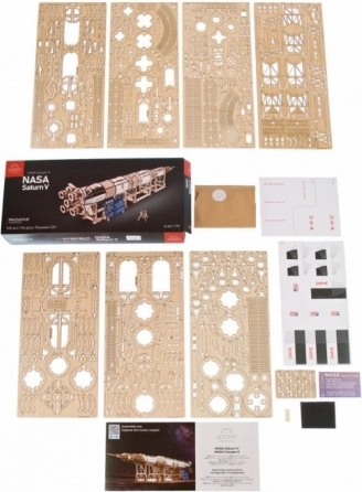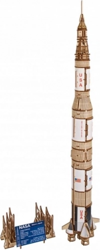 Modellen er fremstillet af kvalitets-, økologisk træ med præcist forudskårne dele til samling uden lim. Takket være den detaljerede manual kan dygtige begyndere klare den, mens erfarne modelbyggere vil værdsætte den tekniske gennemtænkthed, de mekaniske elementer og de gennemarbejdede detaljer, inklusive månemodulet.