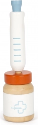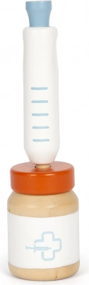 En træsprøjte med fjeder-mekanisme, medicindåse og andre redskaber understøtter autentisk plejeleg.