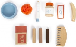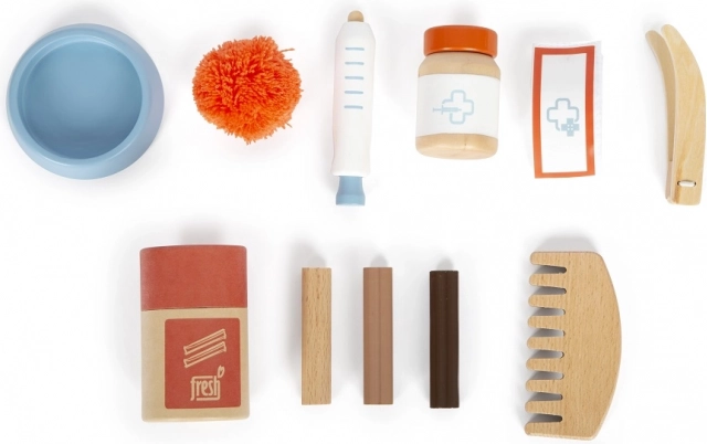 Den praktiske taske med ventilationsnet og opbevaringslommer holder alt tilbehør samlet. Kvalitetsmaterialer i en kombination af træ, plast og tekstil sikrer lang holdbarhed og sikker leg. Sættet inkluderer også en fjederdrevet sprøjte, pincet, bandage og andet tilbehør til realistisk pleje.